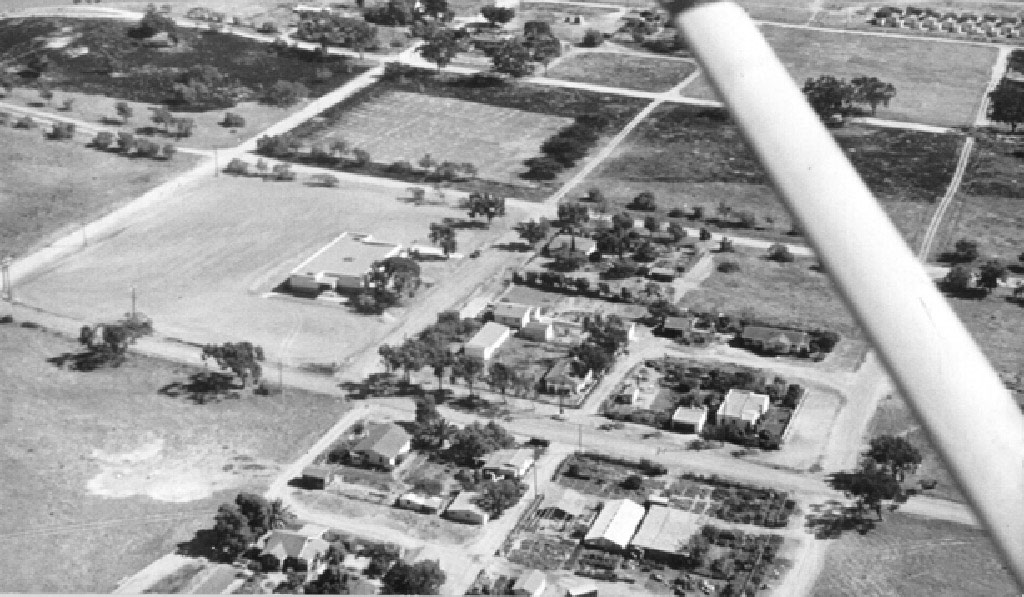 Bay Park School from the air. Notice that Denver St. and the other streets are unpaved. |